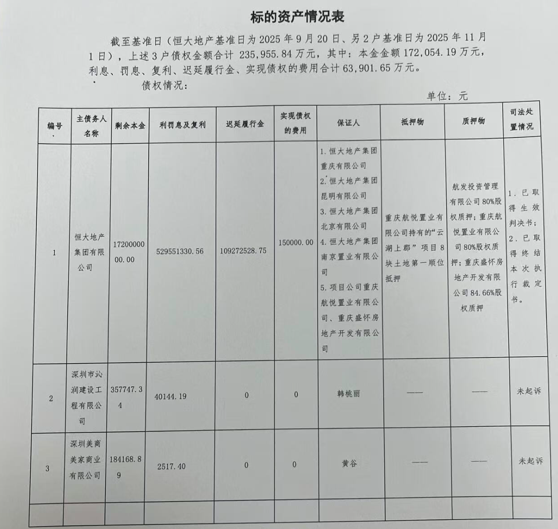 據民生銀行深圳分行此前披露的競買公告,該行對恒大地產集團有限公司、深圳市沁潤建設工程有限公司、深圳美商美家商業有限公司三戶債權進行公開掛牌競價轉讓。截至轉讓基準日(恒大地產集團有限公司基準日為2025年9月20日、另2戶基準日為2025年11月1日),3戶債權金額合計235,955.84萬元,債權本金餘額172,054.19萬元。
