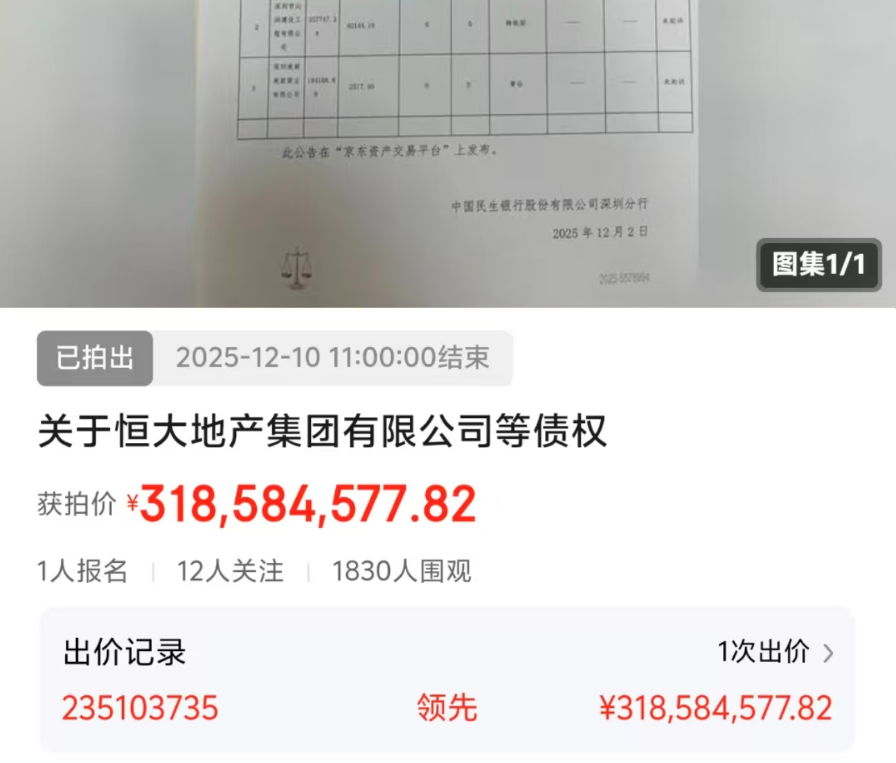 △民生銀行對恒大地產的債權拍出。
