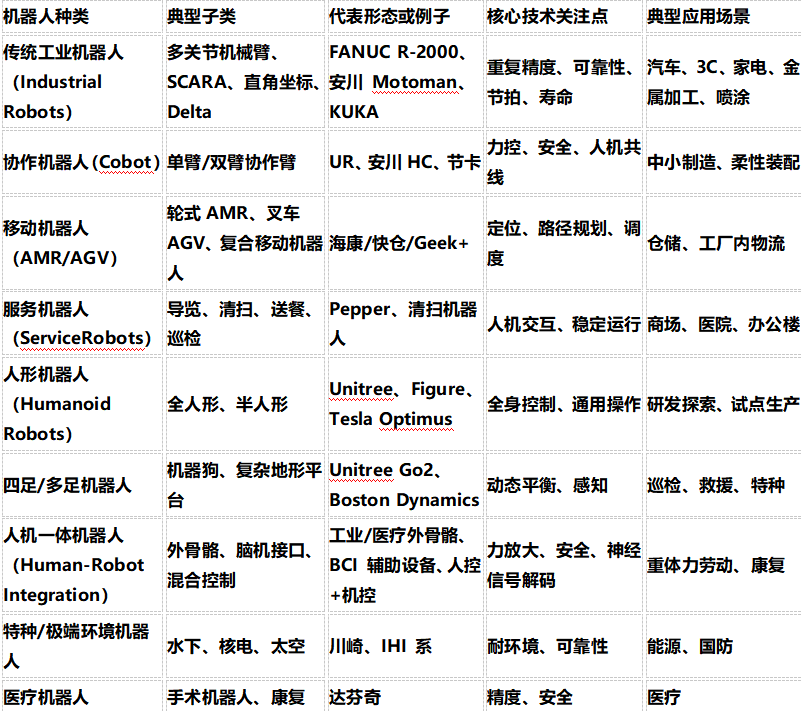 機器人不止人形機器人,還有傳統的工業機器人、協作機器人、醫療機器人等。實際上,目前國際上通用的分類方式,最基礎的分類便是工業vs非工業機器人。