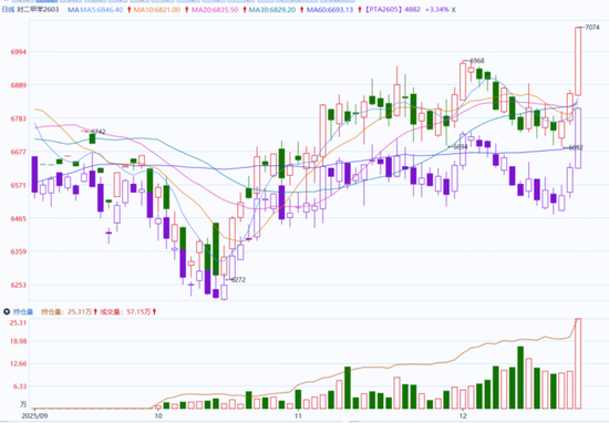 12月19日,PX和PTA主力合約開盤後大幅增倉上漲,走勢突破近3月以來新高。截至19日收盤,PX2603合約上漲252元至7070元/噸,持倉大幅增倉5.2萬手,漲幅達到3.7%;PTA2605合約大幅上漲158元至4884元/噸,持倉大幅增長19萬手,漲幅達到3.34%。四季度起,隨着PX、PTA預期好轉,整體走勢扭轉,底部重心逐步回升。