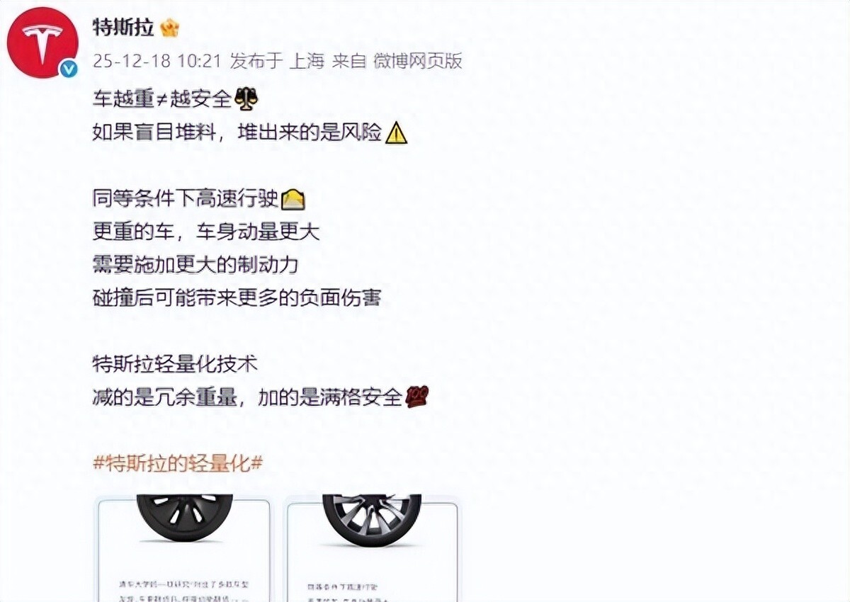 近日特斯拉發佈科普文章,直指行業「盲目堆料」亂象,強調「電動車並非電池越大越安全,車重翻倍不等於安全性能線性提升」。