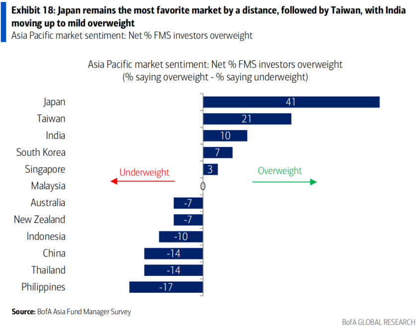 亞太(除日本)行業配置呈現明顯分化:科技硬件(淨 45% 超配)、半導體(淨 41% 超配)、軟件(淨 21% 超配)位居前三,工業與電信(均為淨 10% 超配)緊隨其後;而房地產、能源(均為淨 - 28% 低配)、原材料(淨 - 21% 低配)成為最不受青睞的行業,反映投資者對週期類資產與地產相關板塊的謹慎態度。