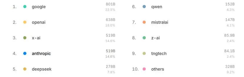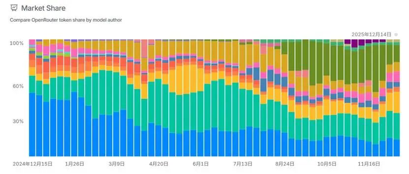 圖:不同大模型廠商的市場份額趨勢,來源:OpenRouter