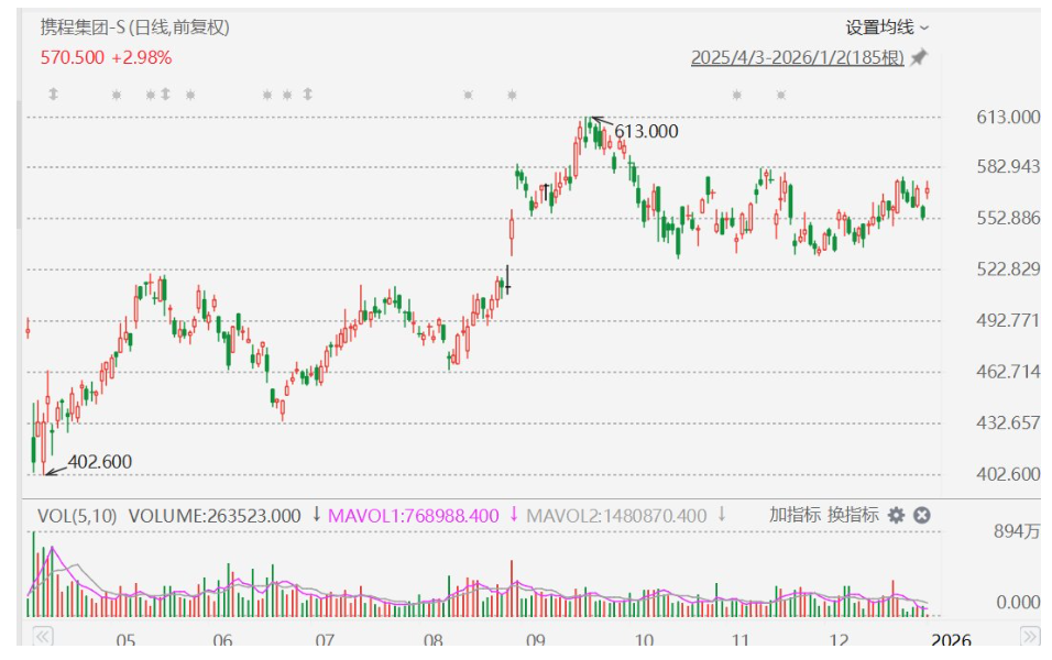 攜程集團-S(9961.HK)盤初漲近4%報574.5港元。消息面上,元旦假期第一天,全社會跨區域人員流動量預計超2.08億人次,比去年同期增長21%。