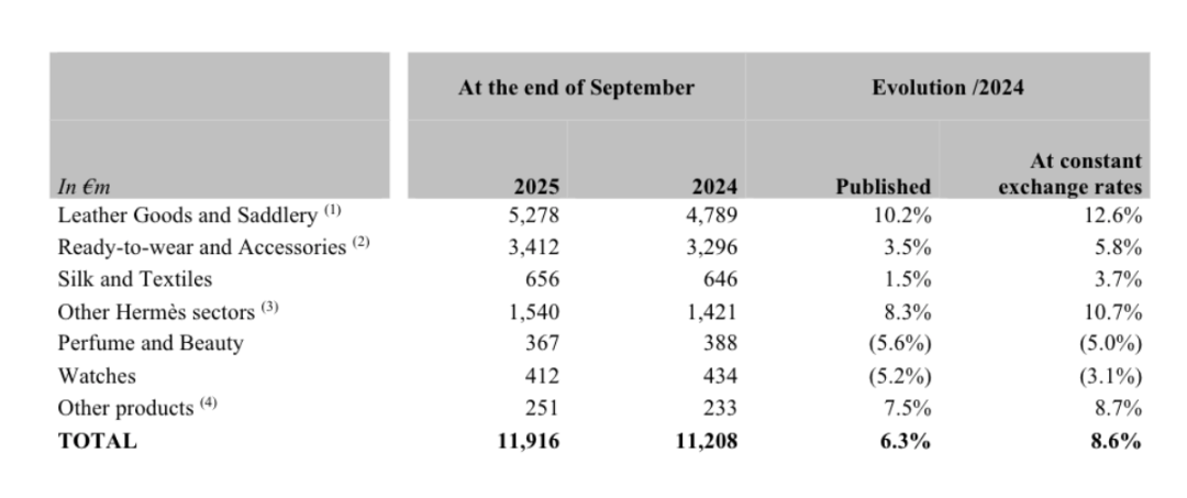 2025年前三季度,愛馬仕的皮具及馬具線收入52.78億歐元,相比2024年增長了10.2%,相比之下,成衣及飾品線收入34.12億歐元,僅增長3.5%;絲綢及紡織品收入6.56億歐元,微增1.5%。另外,被寄予厚望的香水及美妝線、鐘錶線,均有超過5%的下滑。