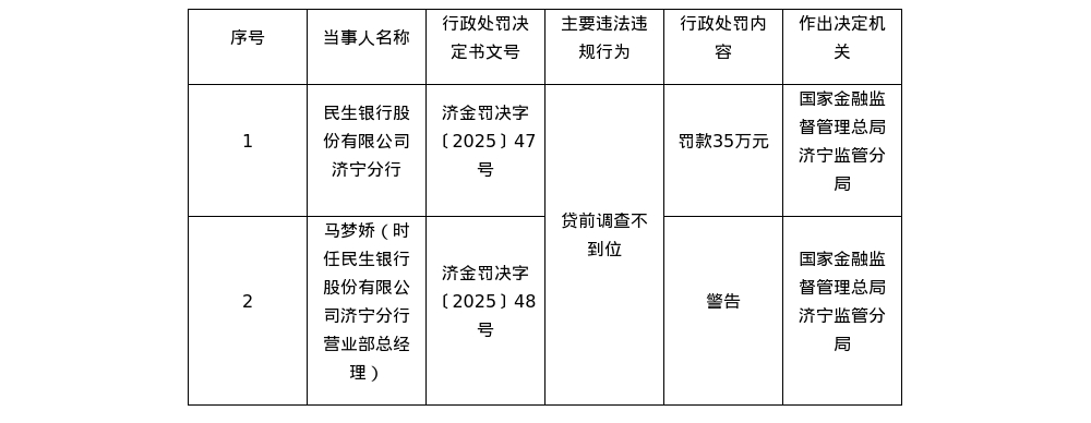 針對上述違法違規行為,國家金融監督管理總局濟寧監管分局對其罰款35萬元;對時任民生銀行股份有限公司濟寧分行營業部總經理的馬夢嬌,給予警告處罰。