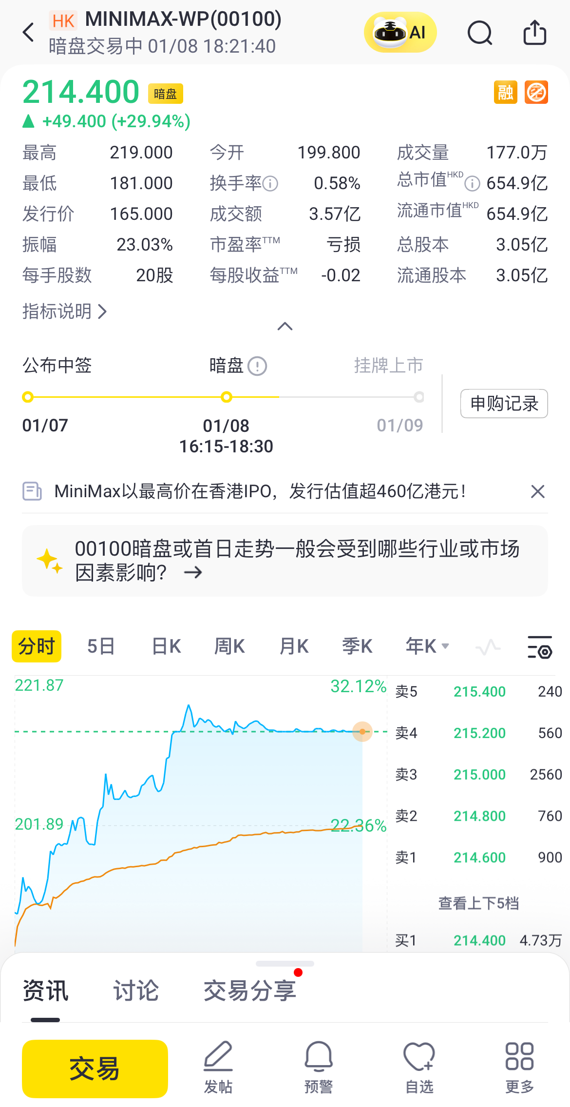 MiniMax定於本週五在香港開始交易。當前,中國大陸及香港市場正迎來一波重量級AI科技企業的上市潮。其競爭對手即智譜週四在香港首掛錶現優異,港股暗盤漲超29%,最高報219港元。MiniMax隨後的市場表現將被視為投資者評估中國AI企業能否有力挑戰美國同行的關鍵風向標。