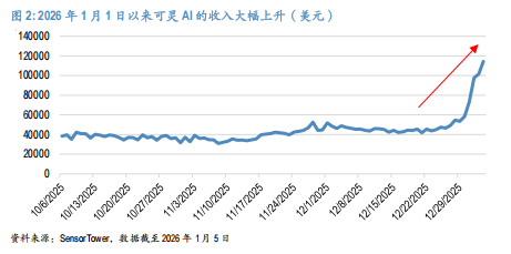 由於"寵物跳舞"視頻在新年引爆海外市場,可靈AI收入暴增。根據Sensor Tower數據,2026年1月可靈AI的移動平台日均收入相比2025年12月暴增102%,其中韓國市場收入更是激增13倍。