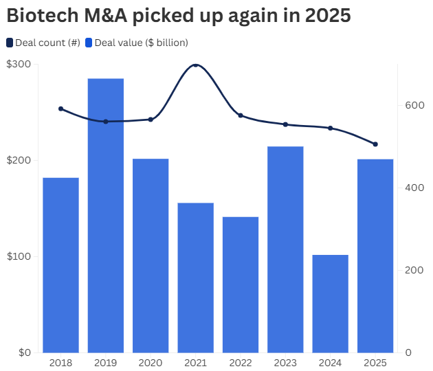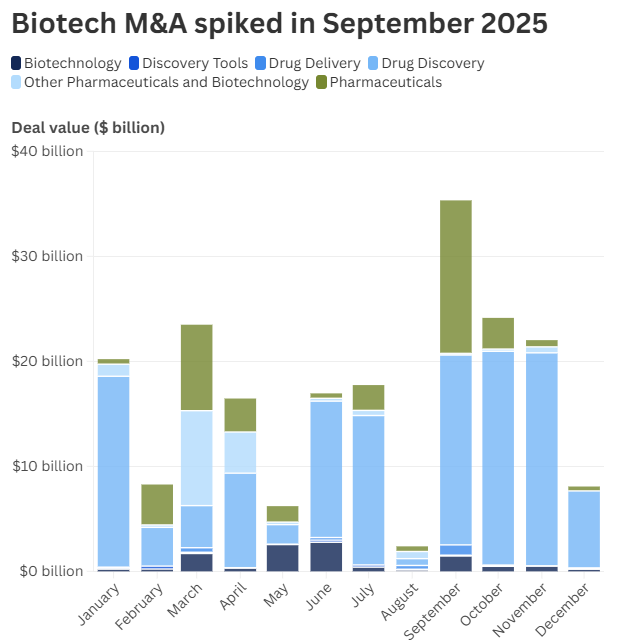 在經歷了年初的低迷之後,2025年9月和10月,生物技術行業的併購活動顯著回升。特朗普政府對高昂藥價的打壓以及對製藥行業徵收三位數關稅的威脅逐漸解除,加之利率周期的開啓,進一步刺激了併購交易。