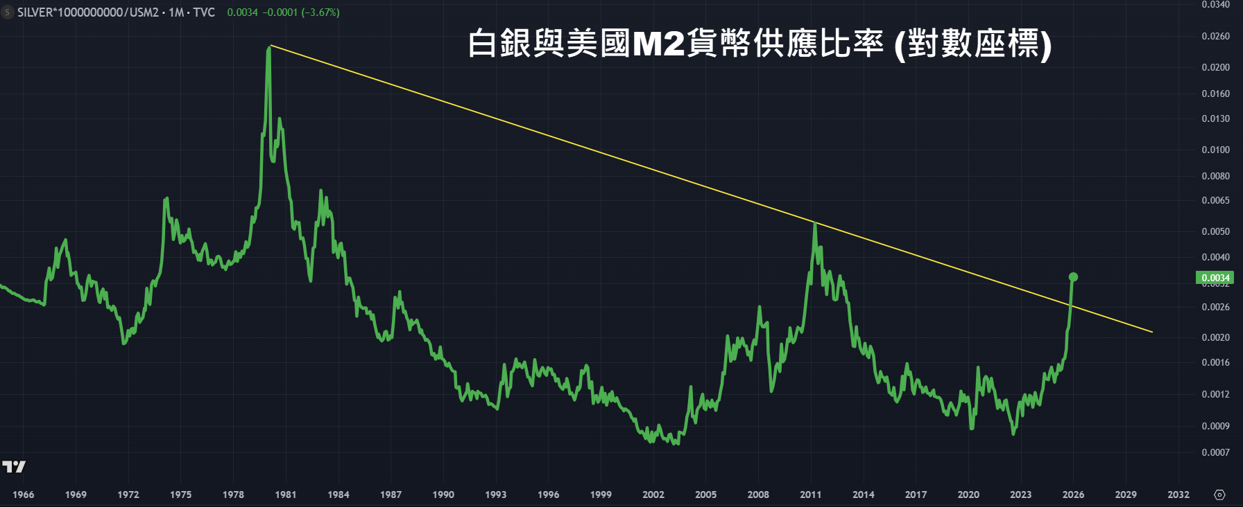 圖1:更值得留意的是,若進一步觀察白銀價格與美國M2貨幣供應的比率(下稱「白銀與M2比率」),可見自2023年起該比率已呈反覆上揚之勢,並於去年底首次成功突破自1980年以來延伸的長期下降趨勢線阻力(圖2)。這一技術性突破,象徵白銀相對於貨幣供應的長期弱勢正式扭轉,意味未來白銀升勢有望持續跑贏M2的增長速度。某程度上,這亦反映愈來愈多資金正流向如白銀般的有形資產,以對沖貨幣氾濫所帶來的購買力侵蝕風險。由此看來,白銀的上行周期,料仍將延續一段不短的時間,尚未到終結之時。圖2:白銀與M2比率向上突破重要阻力