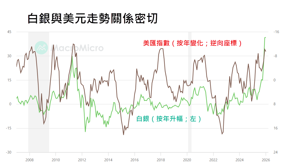 金吾財訊 | 回顧2025年各類資產的表現,不難發現金屬類大宗商品價格明顯領升;其中,白銀升幅接近1.5倍,成為去年表現最佳的資產類別。相較之下,標普500指數全年升幅不足兩成,兩者差距以倍數計,表現高下立見。展望2026年,儘管多數金屬價格,尤其白銀已累積可觀升幅,且近月走勢呈現指數式上揚,現價亦顯着高於長期移動平均線,短期內不排除於本季出現較明顯的回調與整固。然而,從中長期角度觀察,金屬價格的後市發展,尤其白銀,依然值得看好;今年內每盎斯白銀突破100美元關口的機率仍然不低。支持金屬價格持續走強的因素衆多,各種金屬亦各有其獨特的基本面支撐。例如,白銀受惠於工業需求持續擴張及供需長期失衡;黃金則在地緣政治風險升溫、避險資金流入的背景下獲得支持。不過,推動金屬價格上行的,亦存在不少共通因素;其中,主要央行尤其是聯儲局,長期維持相對寬鬆的貨幣政策,令貨幣供應持續擴張,「美元貶值交易」(debasement trade)盛行,均是不容忽視的核心驅動力。事實上,若將美國M2貨幣供應或美元指數的按年變化,與白銀價格走勢一併觀察,不難發現兩者之間存在相當密切的關係。簡言之,當貨幣供應增加或美元貶值時,白銀價格大致呈現強勢;反之亦然(圖1)。換言之,金屬價格走強,某程度上正反映貨幣供應過剩、美元購買力下降,促使大量資金流向有形資產(tangible assets)的結構性趨勢。