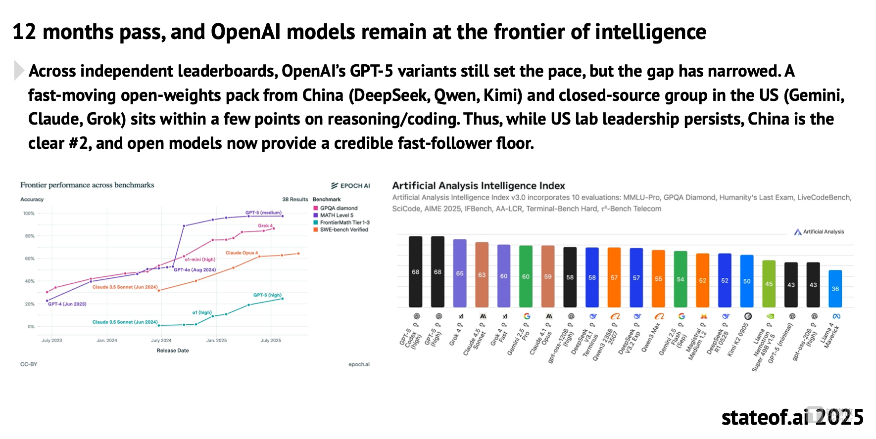 報告認為,開源模型與閉源模型之間的差距雖曾一度縮小,但當前最頂尖的模型仍保持閉源,如GPT-5、GPT-o3、Gemini 2.5 Pro、Claude 4.1 Opus、Grok4等。其中,OpenAI憑藉其最新的GPT-5在多個基準測試中保持領先,繼續鞏固在基礎模型領域的優勢地位。