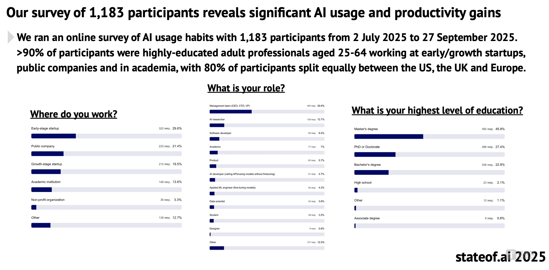 報告還首次對1183名AI從業者進行了調研,結果顯示,95%的專業人士現在在工作或生活中使用AI,76%的人自掏腰包購買AI工具,且大多數人表示生產力持續提高。這充分證明AI的真正普及已成為主流趨勢。