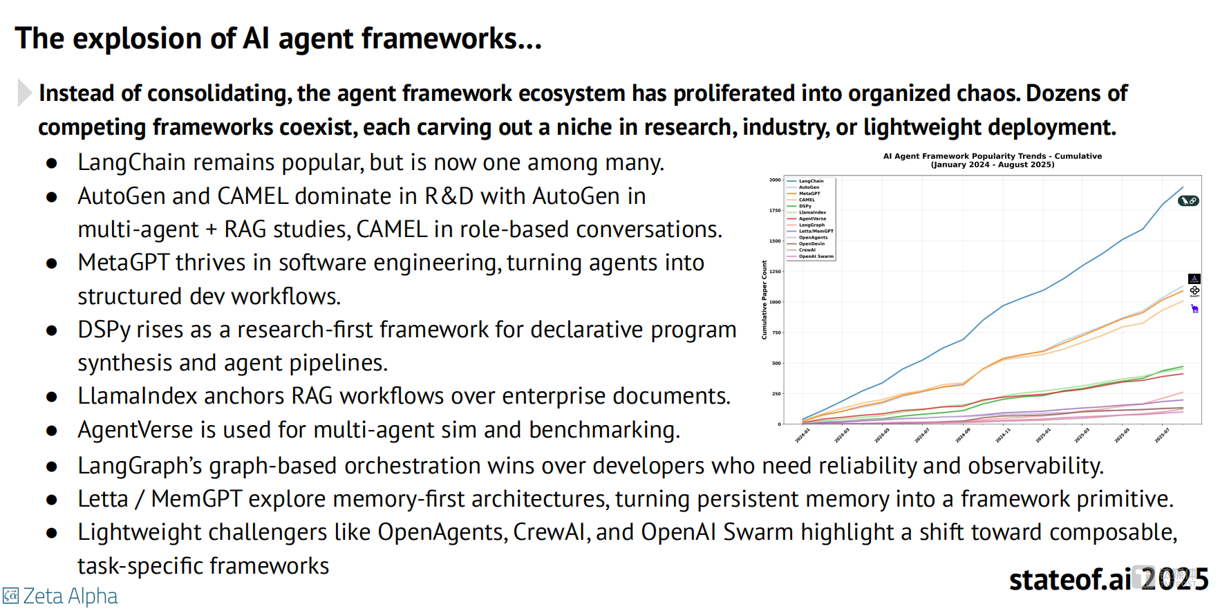 作為構建AI智能體的軟件平台,AI智能體框架發展同樣迅速。儘管LangChain仍廣受歡迎,但如今已只是衆多選擇之一,目前市面上各細分領域已湧現數十種框架,如研發領域的AutoGen、camel,軟件工程領域的MetaGPT等。