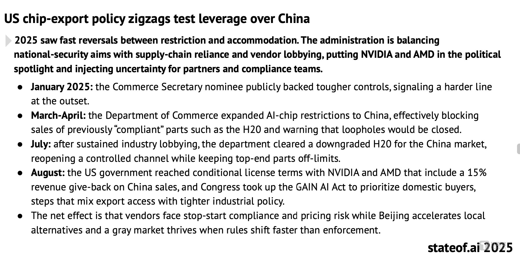 與中國最密切相關的是AI芯片出口限制的相關政策,報告用「反覆」來形容。事實上,美國政府在國家安全目標與供應鏈依賴、供應商遊說這見尋求平衡,這使得英偉達和AMD成為政治焦點。報告指出,英偉達在中國市場並未達到穩定狀態。