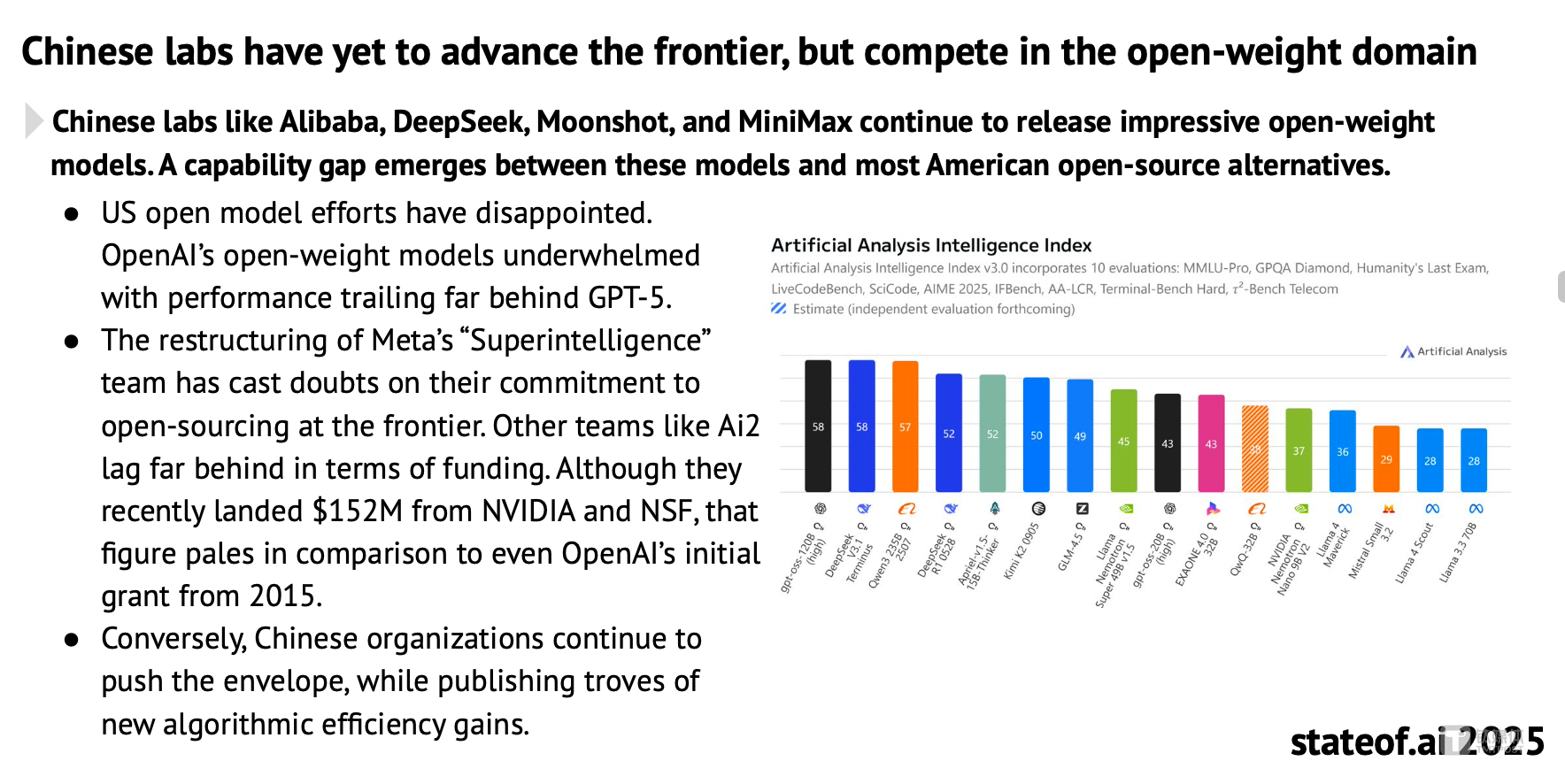 儘管中國基礎模型尚未取得突破性進展,但在開源模型領域卻頗具競爭力。相比之下,美國的開源模型表現令人失望,OpenAI的開源模型性能遠遜於GPT-5。