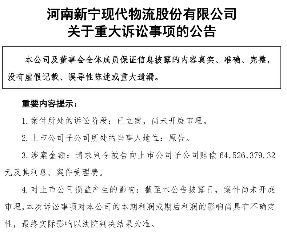 終審判決生效後,案件進入執行階段。彼時新寧物流因財務壓力顯著,股票已被實施退市風險警示,現金流枯竭導致一次性清償無法實現。