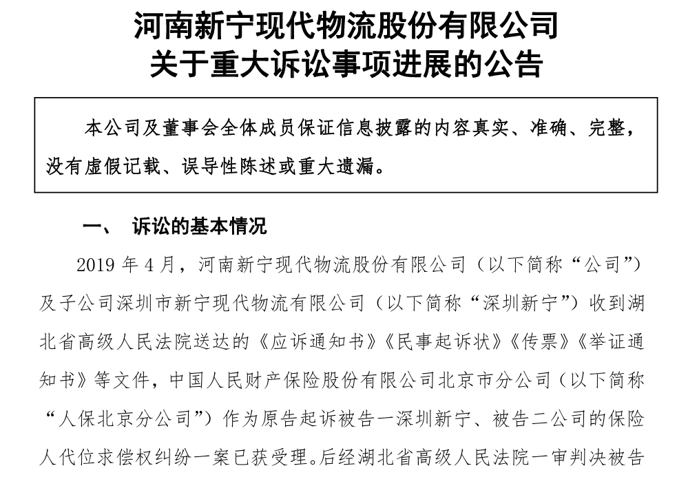 2019年4月,中國財險北京分公司以原告身份,向湖北省高級人民法院提起針對深圳新寧(被告一)及新寧物流(被告二)的保險人代位求償權糾紛訴訟,該案當日獲法院受理。此時距火災發生已逾三年。