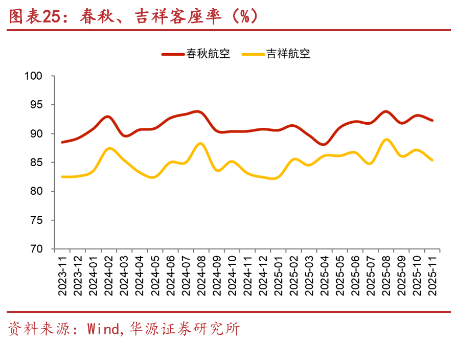 2025年11月,三大航整體客座率為85.57%,較2025年10月的86.88%下降1.32pcts,春秋航空以92.31 %的客座率持續領跑行業。