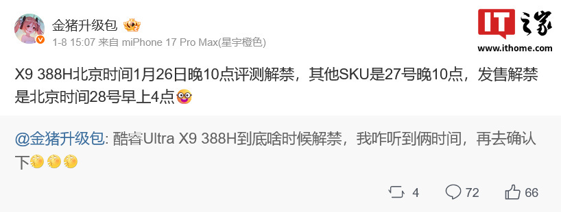在英特爾的酷睿 Ultra(第三代)處理器方面,筆記本電腦消息人士 @金豬升級包 在其微博動態中表示,旗艦型號酷睿 Ultra X9 388H 將於北京時間 1 月 26 日 22:00 評測解禁、其餘型號 1 月 27 日 22:00 評測解禁,發售解禁時間是 1 月 28 日 04:00。