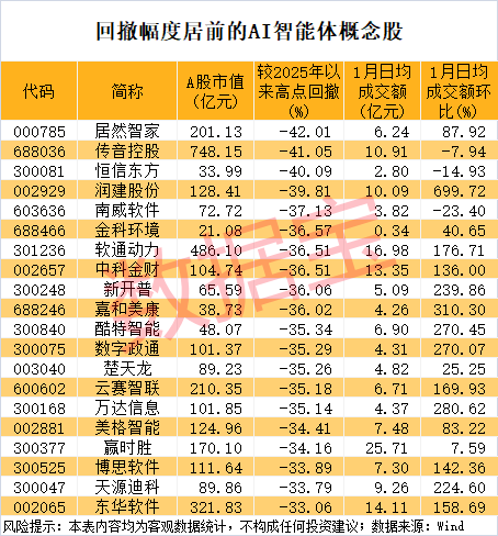 今年年初,AI智能體概念熱度爆棚,誕生多隻牛股,近期隨着熱度降溫,不少概念股已出現明顯回撤。據證券時報·數據寶統計,截至1月19日收盤,最新收盤價較2025年以來高點回撤20%以上的AI智能體概念股有84只。居然智家、傳音控股、恒信東方、潤建股份、南威軟件等回撤幅度靠前。