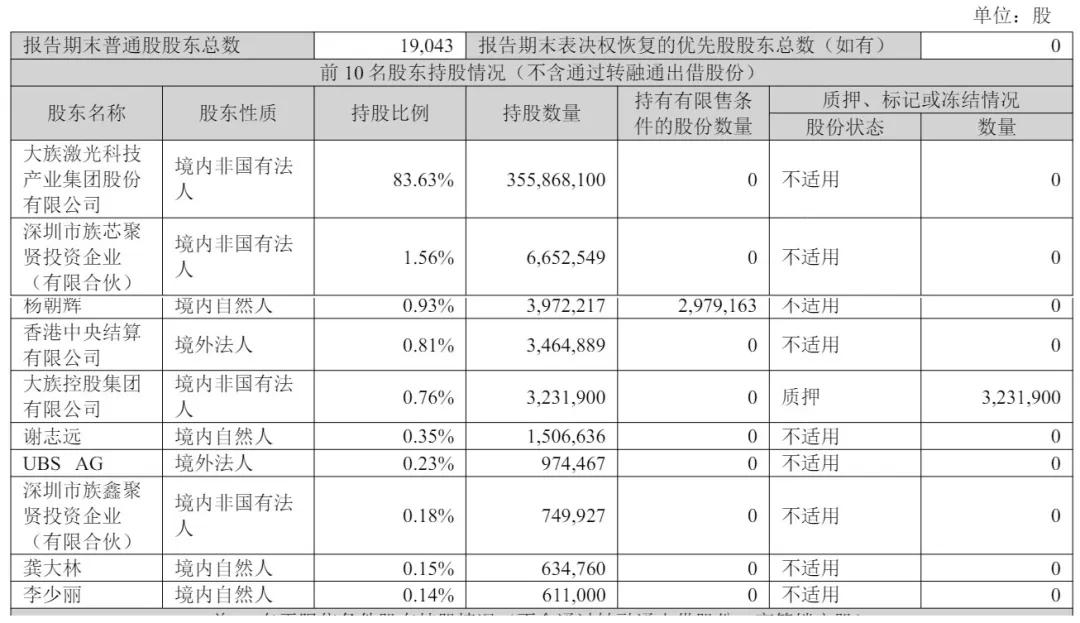 截至2025年9月30日,大族激光科技產業集團股份有限公司持股為83.63%,深圳市族芯聚賢投資企業(有限合夥)持股為1.56%,楊朝輝持股為0.93%,香港中央結算有限公司持股為0.81%,大族控股集團有限公司持股為0.76%;