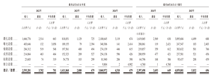 於2022年、2023年、2024年以及截至2024年及2025年10月31日止十個月,公司分別銷售2,514台(套)、1,129台(套)、3,119台(套)、2,569台(套)及4,499台(套)鑽孔設備,產銷率分別為121.1%、81.6%、108.9%、114.2%及98.9%。
