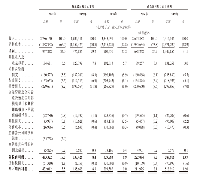 財務方面,於2022年度、2023年度、2024年度及2025年截至10月31日止十個月,公司分別錄得收入27.86億元(人民幣,下同)、16.34億元、33.43億元及43.14億元。