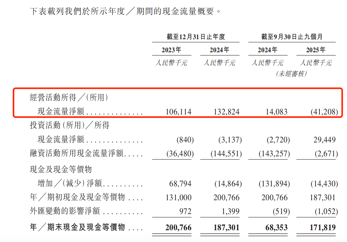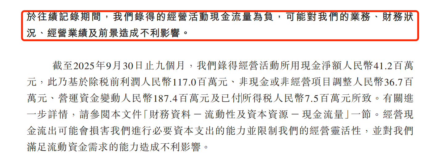 在公司尋求IPO募資擴產的關鍵節點,其派息動作卻極為激進。2023年至2024年,公司累計派息1億元;2025年前三季度,又宣派股息1億元。尤為值得關注的是,2025年前三季度公司經營活動產生的現金流為負,在此背景下仍堅持高額派息,這種「突擊派息」的行為引發了市場對其資金狀況的擔憂。