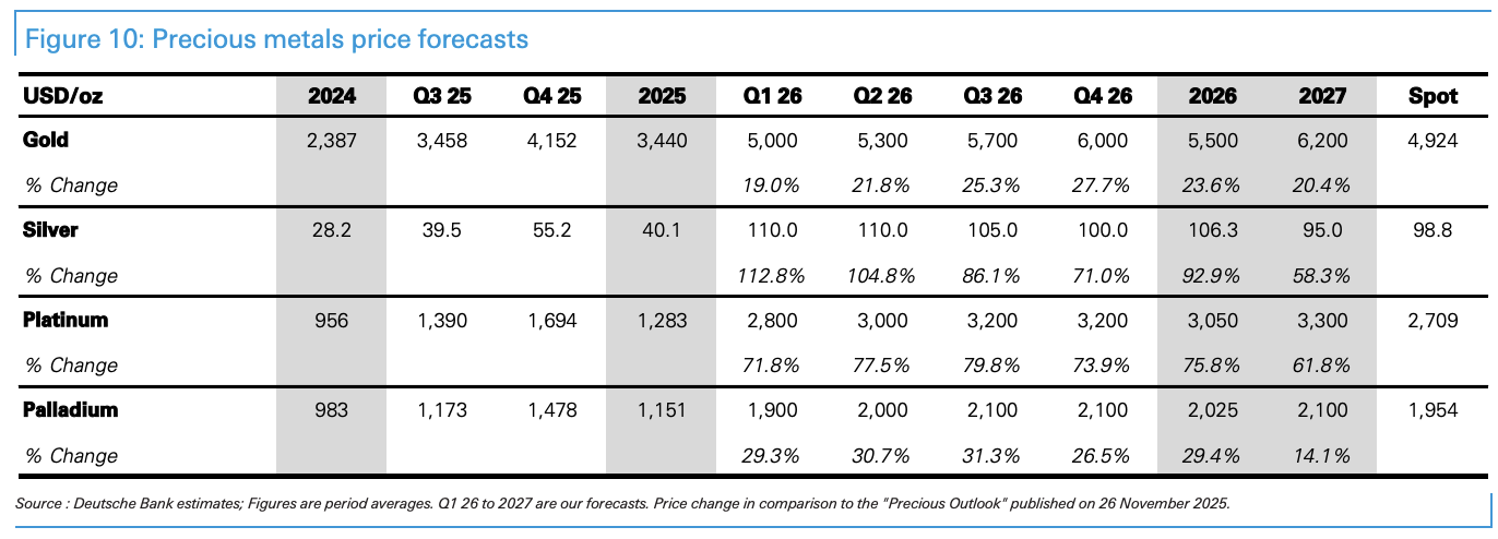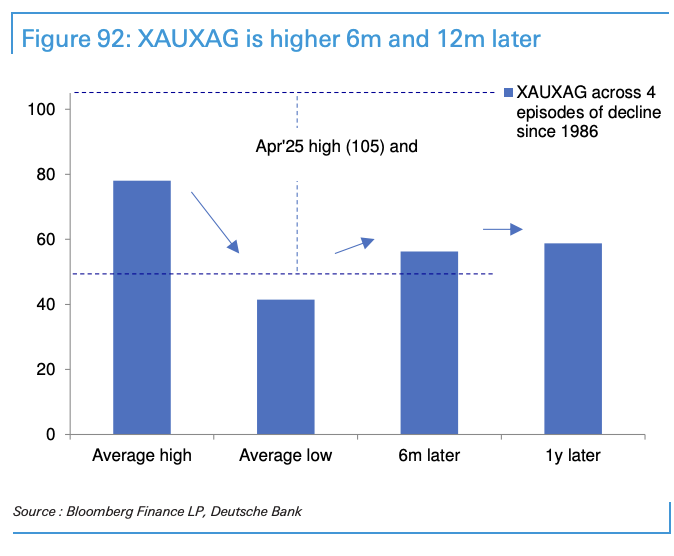 白銀方面,德銀判斷12月以來「白色金屬」出現了新增亞洲投資需求,白銀絕對價格可能更高;但從歷史上看,XAUXAG(金銀比)在劇烈波動後通常會均值迴歸而非徹底反轉,德銀的路徑假設是到2027年金銀比回到65、白銀約95美元/盎司。