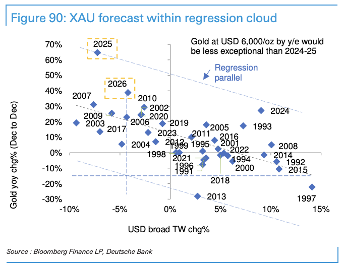 德銀迴歸模型得出,一般情景下,今年黃金價格將漲至6000美元/盎司。在樂觀情景下,價格將漲至6900美元/盎司;在悲觀情況下,美元意外走強,金價下限為3700美元/盎司。