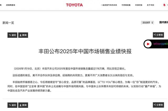 觀車君還注意到,就在召回風波發酵之際,豐田中國發布了一份堪稱「亮眼」的成績單:2025年在華銷量超過178萬輛,實現按年正增長。