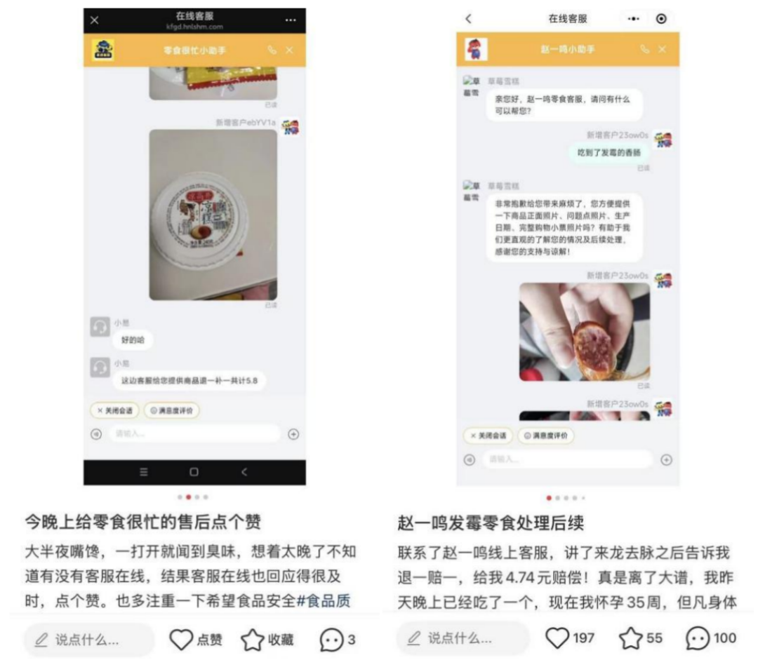 另一位懷孕的女士透露,在鳴鳴很忙旗下的「趙一鳴」購買的香腸發黴了,儘管客服很快響應、賠償,但她還是提心吊膽了好幾天。