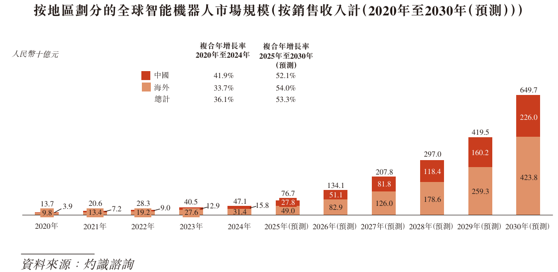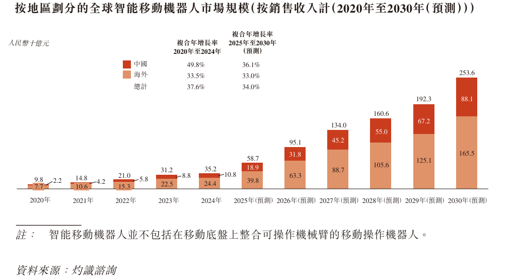 按銷售收入計,全球智能移動機器人市場規模由2020年的98億元增至2024年的352億元,複合年增長率為37.6%,預期到2030年將達2,536億元,2025年至2030年的複合年增長率為34.0%。在中國,智能移動機器人市場規模由2020年的22億元增至2024年的108億元,複合年增長率為49.8%,預期到2030年將達881億元,2025年至2030年的複合年增長率為36.1%。
