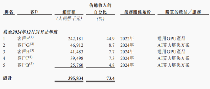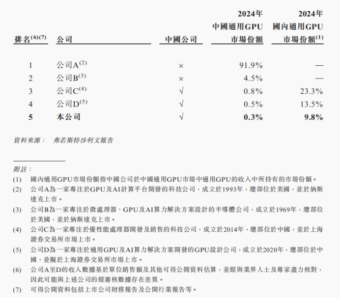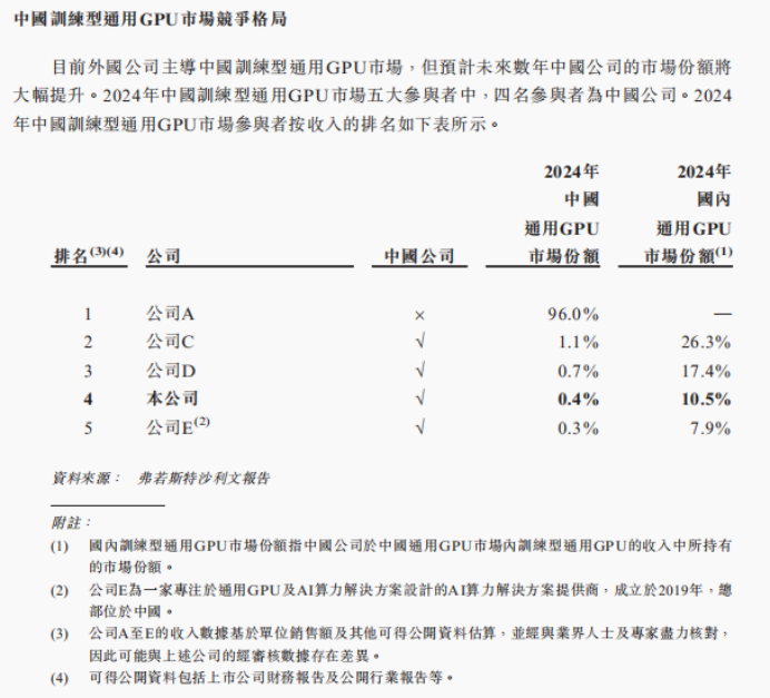 天數智芯招股書顯示,2024年,按收入計,包括天數智芯在內的三家中國公司已躋身中國通用GPU市場五大參與者之列,其中天數智芯排名第5,市佔率達到0.3%,根據附註推斷,排名前四的公司或分別別為英偉達、AMD、海光信息與沐曦集成。