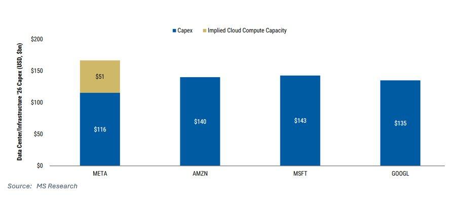 亞馬遜的資本開支最為不透明,因其未拆分AWS基礎設施與零售業務。摩根士丹利預計2026年基礎設施資本開支為1400億美元,總資本開支為1750億美元,而2025年指引為1250億美元。