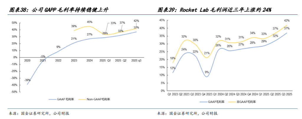 數據驗證了戰略轉型的成功。公司營收從2020年的3516萬美元激增至2024年的4.36億美元,五年增長超10倍。更關鍵的是盈利質量的改善,GAAP毛利率在兩年半內翻倍,從11.6%修復至2025年Q3的37.0%。這得益於發射複用技術的成熟和垂直整合帶來的BOM成本下降。