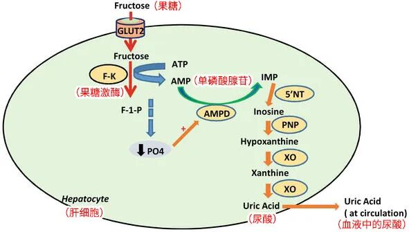 葡萄糖被吸收進入血液後,主要用於供能,多餘的會以糖原的形式儲存在肌肉、肝臟中,或進入脂肪細胞以備不時之需。果糖進入人體後,則會被運送到肝臟進行代謝。在肝臟中,分解果糖的酶開始工作,一系列複雜過程中會有一種叫做單磷酸腺苷(AMP)的物質形成,而它正是尿酸生成的底物。