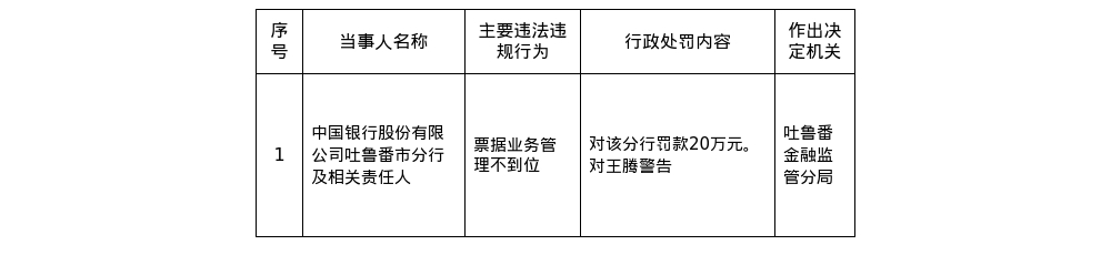 罰單顯示,中國銀行吐魯番市分行的主要違法違規事實為:票據業務管理不到位。
