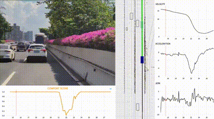 AI指標模塊,就是根據安全、合規、舒適、效率等多維度建立的一套量化評估體系,它能將自動駕駛的行駛數據轉化為可對比、可分析的指標。例如在道路被侵入的場景中,AI指標模塊就實時打出了乘客舒適度評分。評分反饋能直接可視化,訓練環節就能針對性優化與複驗。值得一提的是,下圖的畫面、數據都是由WeRide GENESIS生成。目前行業要完成舒適性測試,基本都要靠真實場景測試完成。