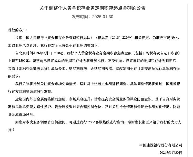 建設銀行1月30日,建設銀行發布公告調整個人黃金積存業務定期積存起點金額。自2月2日9:10起,建行個人黃金積存業務定期積存起點金額(包括日均積存及自選日積存)上調至1500元。