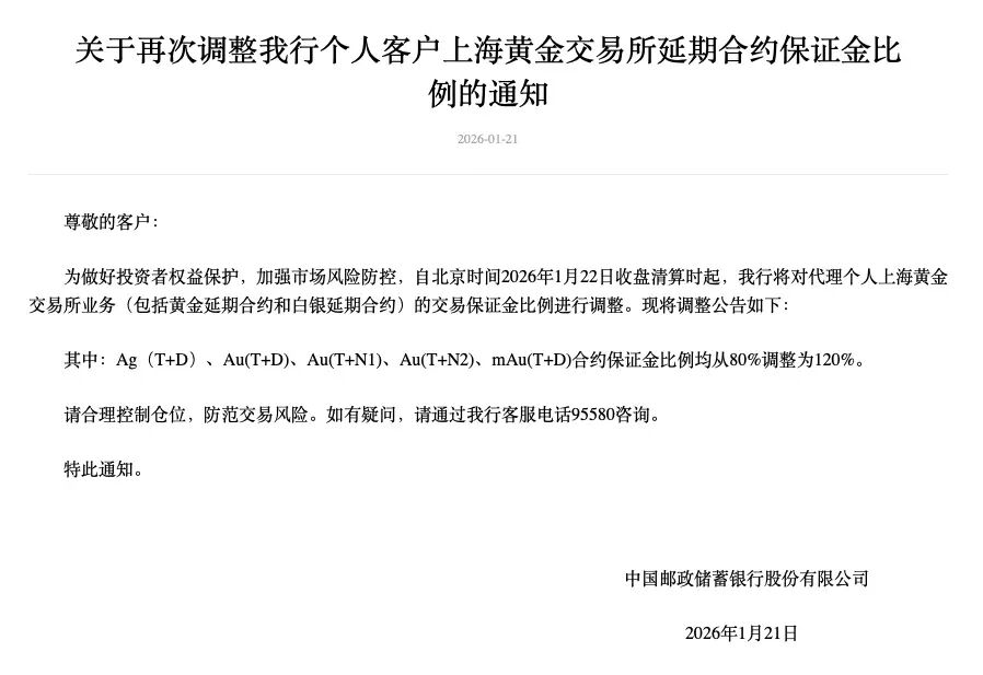 郵儲銀行1月21日,郵儲銀行發布《關於再次調整我行個人客戶上海黃金交易所延期合約保證金比例的通知》,自1月22日收盤清算時起,將Au(T+D)、Au(T+N1)、Au(T+N2)、mAu(T+D)等合約保證金比例從80%調整為120%。