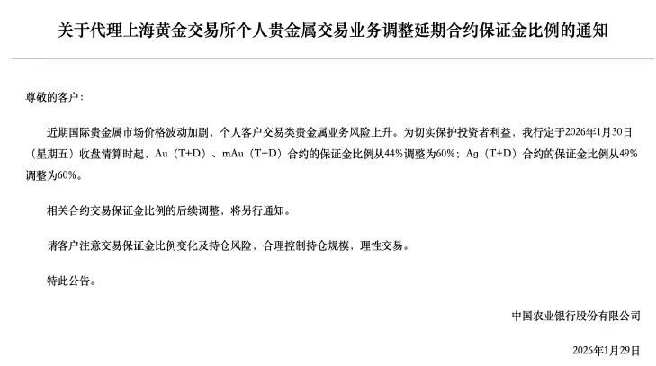 農業銀行1月29日,農業銀行發布《關於代理上海黃金交易所個人貴金屬交易業務調整延期合約保證金比例的通知》,於1月30日收盤清算時起,Au(T+D)、mAu(T+D)合約的保證金比例從44%調整為60%。同時,農行請客戶注意交易保證金比例變化及持倉風險,合理控制持倉規模,理性交易。