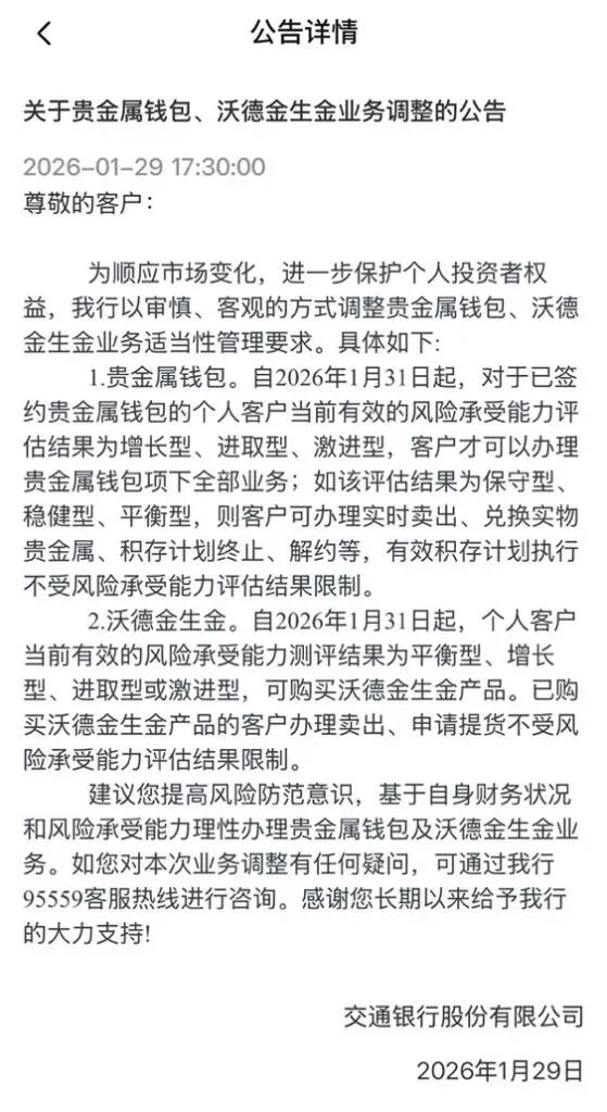 交通銀行1月29日,交通銀行發布公告調整貴金屬錢包、沃德金生金業務適當性管理要求。具體來看,關於貴金屬錢包,自1月31日起,對於已簽約貴金屬錢包的個人客戶當前有效的風險承受能力評估結果為增長型、進取型、激進型,客戶纔可以辦理貴金屬錢包項下全部業務,如該評估結果為保守型、穩健型、平衡型,則客戶可辦理實時賣出、兌換實物貴金屬、積存計劃終止、解約等,有效積存計劃執行不受風險承受能力評估結果限制;關於沃德金生金,自1月31日起,個人客戶當前有效的風險承受能力測評結果為平衡型、增長型、進取型或激進型,可購買沃德金生金產品。交行提示,建議客戶提高風險防範意識,基於自身財務狀況和風險承受能力理性辦理貴金屬錢包及沃德金生金業務。