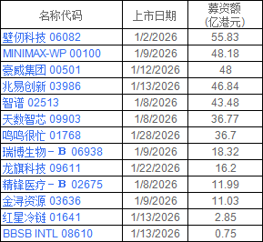進入2026年1月,這一強勁勢頭得到進一步延續和強化,當月共有13家企業成功登陸港交所,其中12家登陸主板、1家登陸創業板,募資總額達382億港元,開局表現亮眼,13家公司鳴「鑼」當日均以漲幅收盤,無一破發,相較上月氣氛顯著轉好。