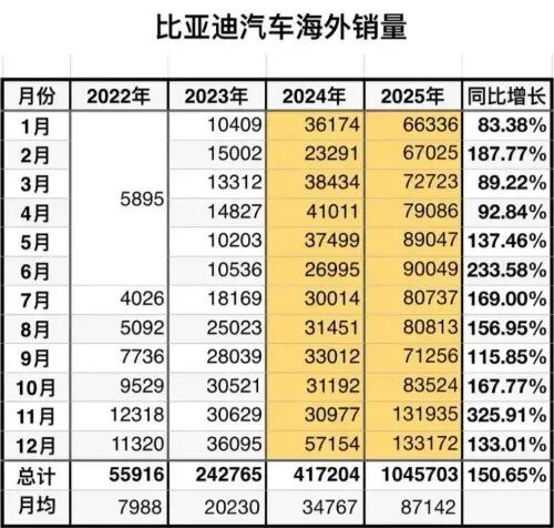 然後2025年,比亞迪汽車出口量首次突破百萬輛大關,成為繼奇瑞之後中國排名第二的汽車出口大廠。