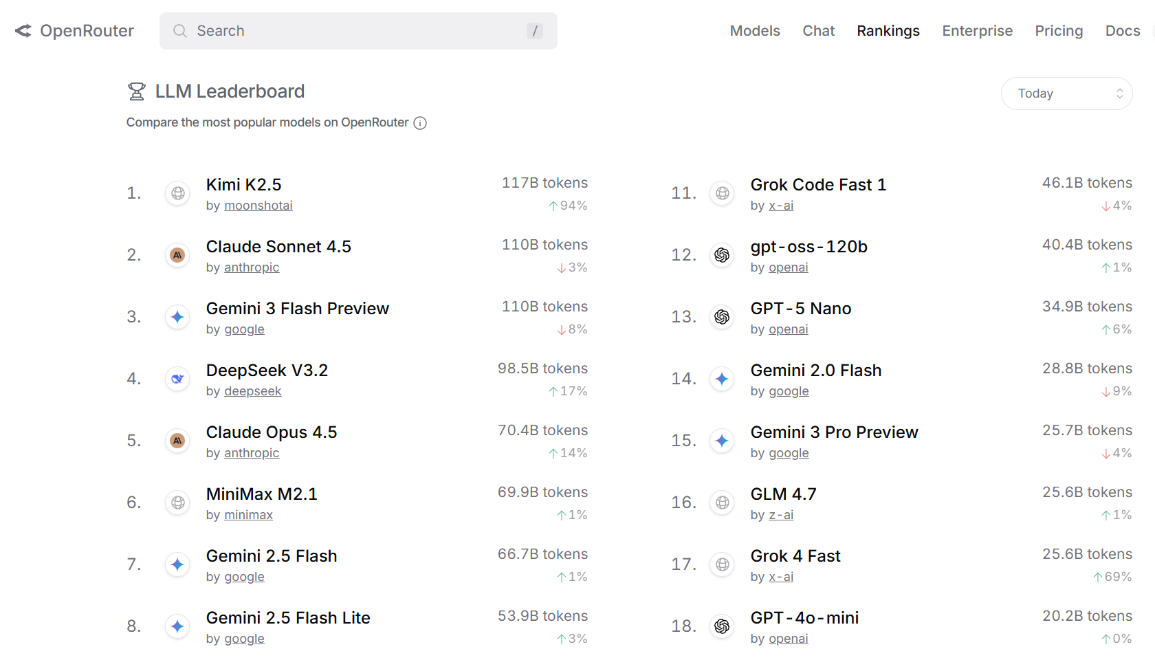 據大模型聚合平台OpenRouter數據,目前,Kimi K2.5已超過谷歌的Gemini 3 Flash Preview、Anthropic的Claude Sonnet 4.5以及Deepseek的DeepSeek V3.2等模型排名第一。