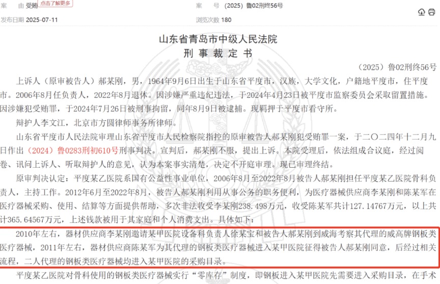從醫保局的通報和案件判決書來看,這起「回扣」案是醫療器械供應商李某剛代理的威高牌產品,李某剛為了達成長期「合作」,還曾帶領郝某剛到威海實地考察威高牌鋼板類醫療器械。