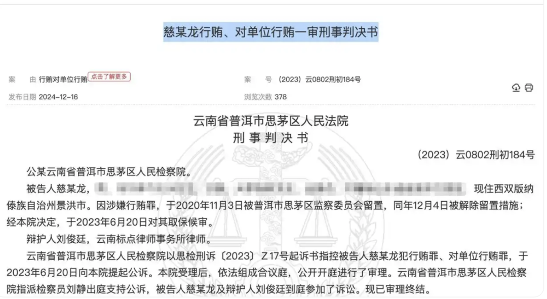 中國裁判文書網信息顯示,該判決書是雲南省普洱市思茅區人民法院於2023年9月19日作出的,2024年12月16日公示在中國裁判文書網。