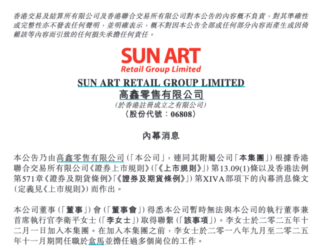 春節腳步越來越近,零售業進入年貨備戰的衝刺階段,線上線下紅火一片,各大商超貨架滿滿、促銷火熱,全力爭奪春節消費市場。然而,商超界一片忙碌之中,行業巨頭大潤發母公司高鑫零售(6808.HK)一則公告引發市場譁然:公司無法與上任僅兩個月的執行董事兼首席執行官李衛平取得聯繫。